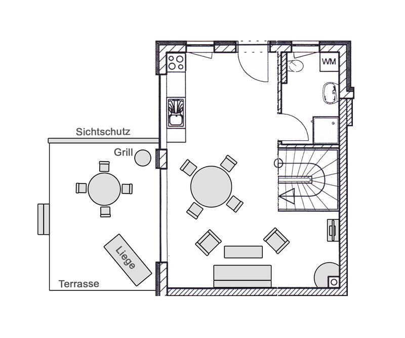 Der großzügig gestaltete Wohn-/ Essbereich entspricht in seiner Ausstattung gehobenen Ansprüchen. Von dort aus gelangen Sie auf die gemütliche Terrasse. Hier können Sie nach dem Mittag bis in den Abend die Sonne auf unseren Gartenmöbeln (inkl. Gartenliege) genießen oder z. B. grillen. Elegante Möbel, frische Farben und liebevolle Details sorgen für eine Atmosphäre zum Wohlfühlen. Der Raum verfügt über eine gemütliche Sitzecke mit großem Sofa und Sessel, eine Essgruppe, SAT-LCD-TV sowie Radio-CD-Anlage und "Wii-Station" für Klein und Groß.