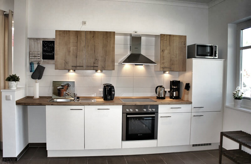 Die moderne und funktionale Küchenzeile ist im Wohnbereich integriert und lässt keine Wünsche offen: Neben einem Backofen, Cerankochfeld, Kühlschrank mit Eisfach, einer Mikrowelle ist sie zusätzlich mit einer Spülmaschine ausgestattet.